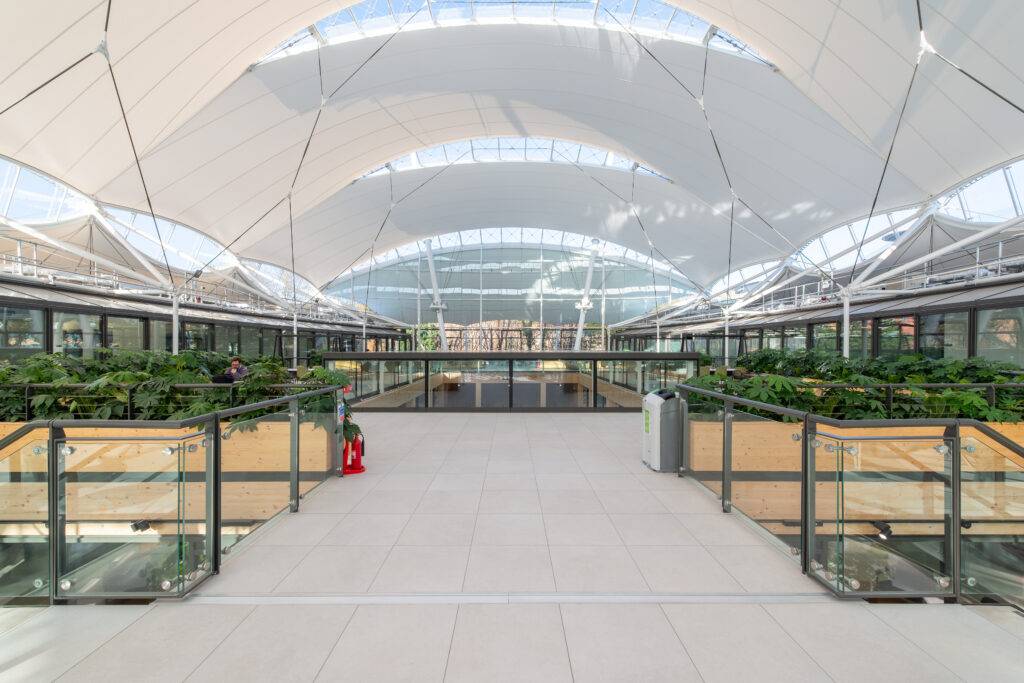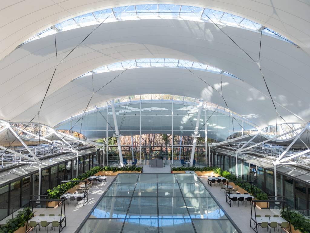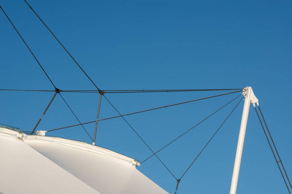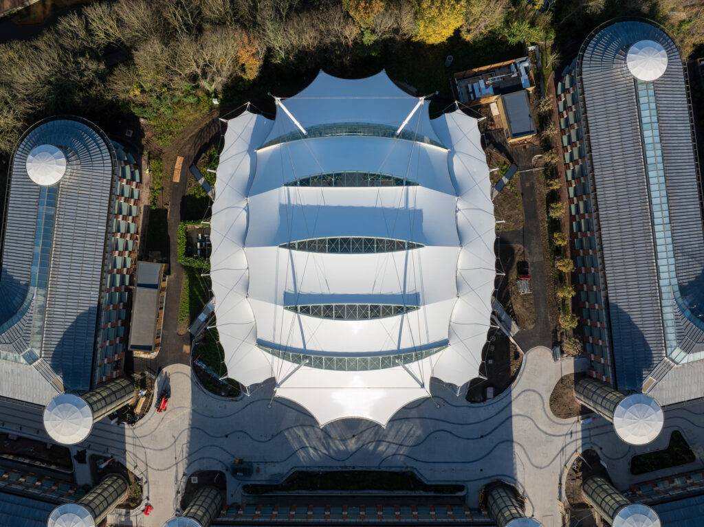 The intricate design of this unique tensile fabric roof required expert analysis from tensegrity structure specialists, Tensys Ltd. Their engineering expertise and detailed installation planning, carried out in collaboration with Base Structures, enabled the safe and successful removal of the existing canopy and glazing. Base Structures’ team of tensile fabric specialists skilfully navigated the challenges encountered during the planning process, ensuring a safe and smooth transition from the old canopy to installation of the new.