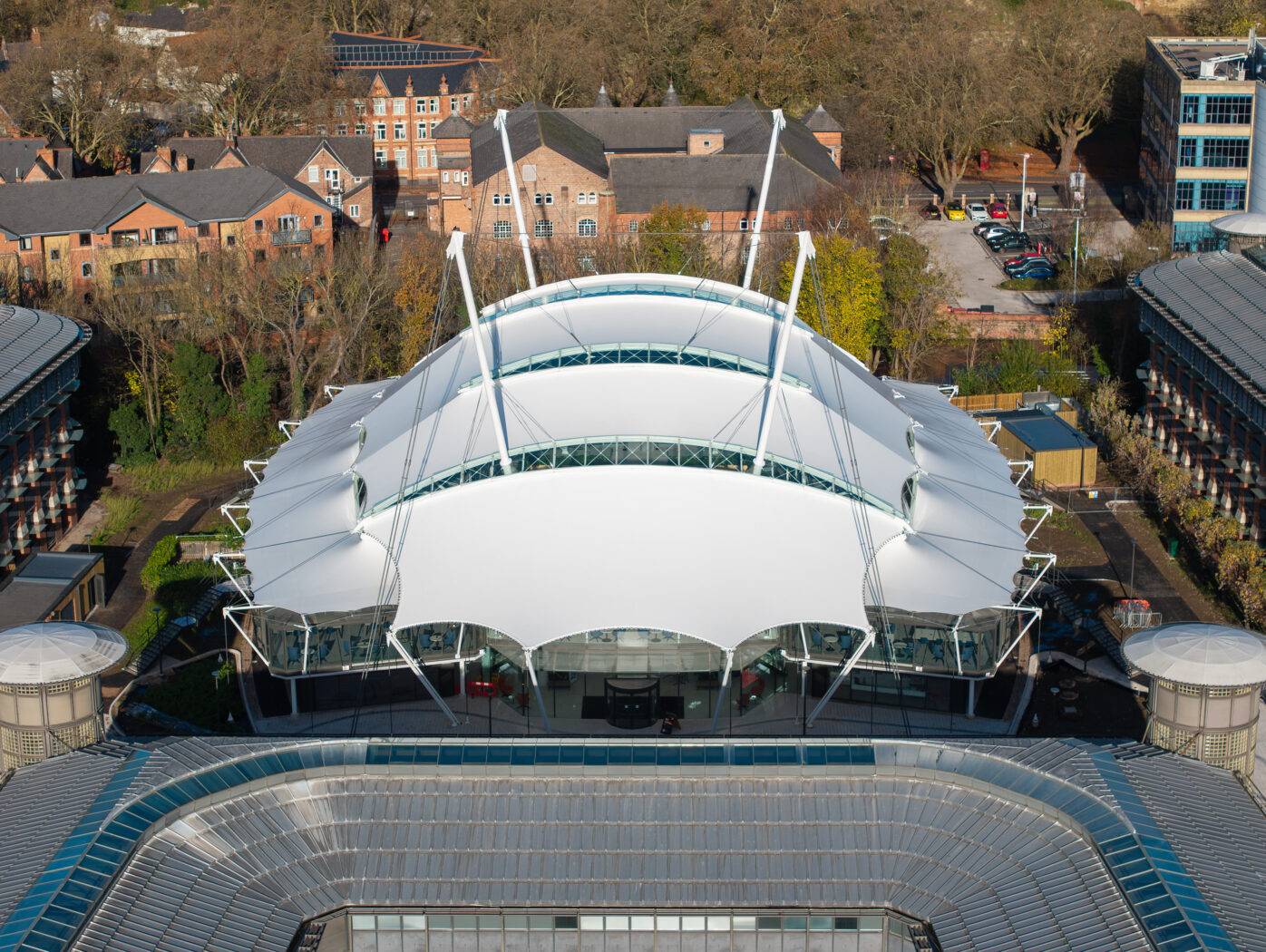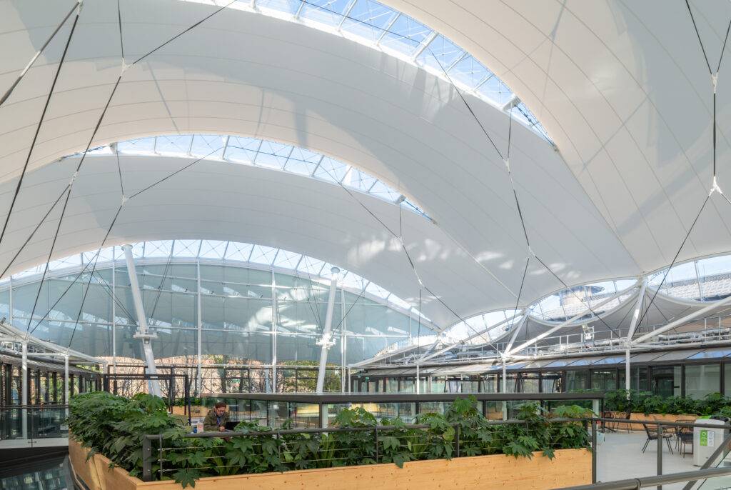 The newly installed tensile fabric roof at the University of Nottingham’s Castle Meadow Campus marks a bold step in the site’s transformation. Replacing one of Europe’s most complex roof structures, the new canopy brings a sleek, modern aesthetic that complements the surrounding architecture and reinforces the University’s commitment to sustainability, innovation, and design excellence.