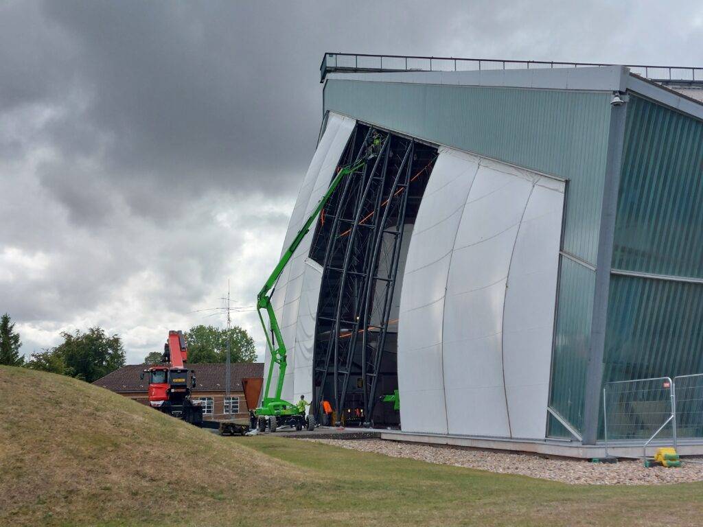With the opening prepared, the Museum completed its aircraft movements in a single day, carefully guiding the Whirlwind helicopter and Argosy fuselage into their new homes. Once this phase was complete, our team returned to site for a further four days to reinstate the steel supports and re-tension the fabric panels, restoring the curtain wall to its original appearance and performance.